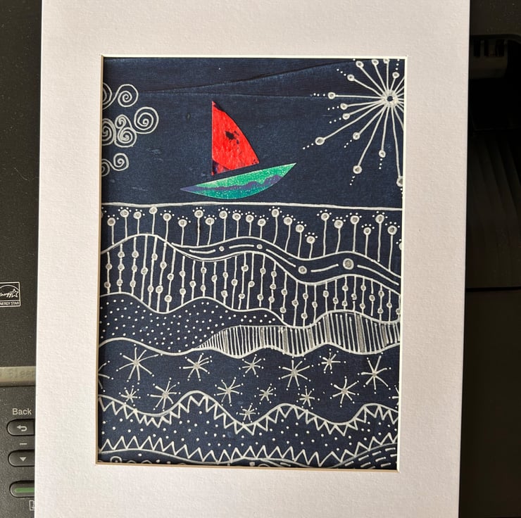 Original Handmade paper with doodle art . Boat in the moonlight . Mounted A4.