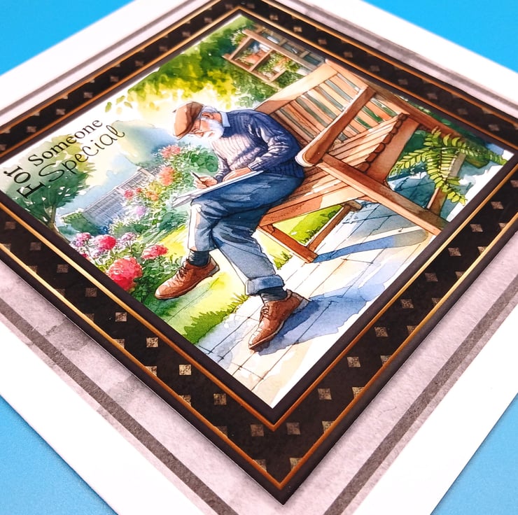 The main image is of a beautiful peaceful garden with a gentleman sitting on a garden bench this image has a 3d effect