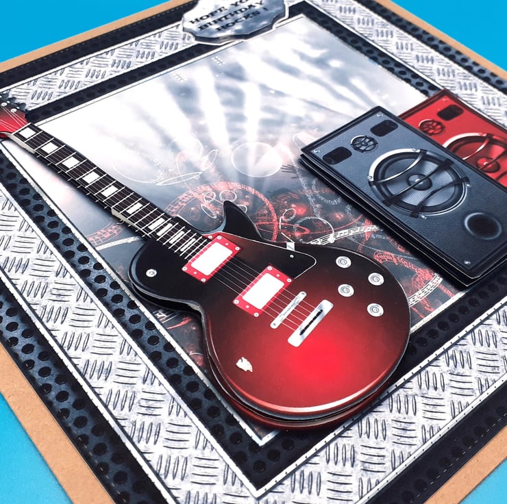 The main design of the card is of a 3d red guitar and two 3d speakers one in black and one in red