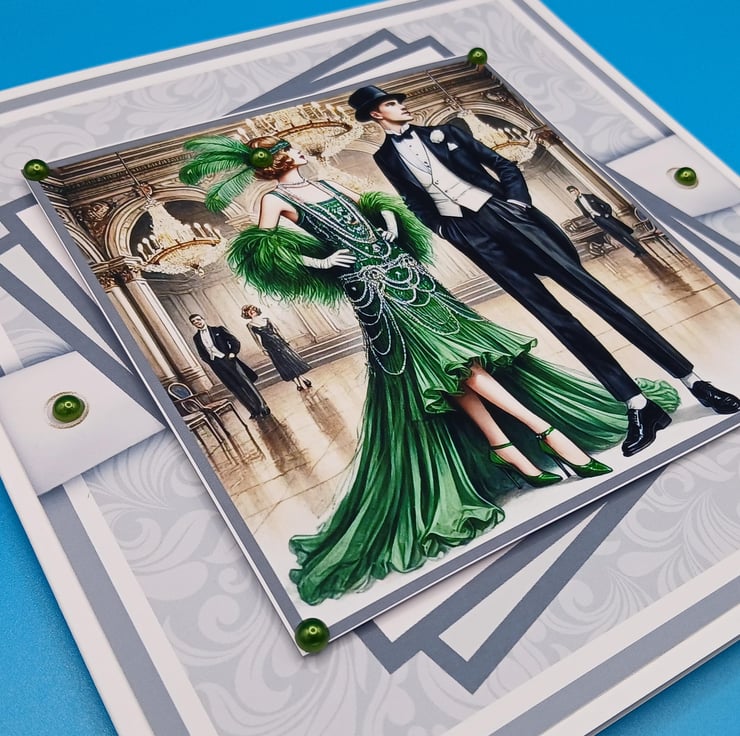 The main design is of squares at different angles and the main one has a couple dressed in clothes fron the art deco era and in the background are images of a ballroom, I have added dark green pearl effect acrylic beads to give the card a special look