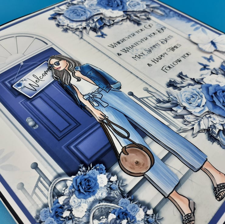 A lady is standing in front of the door dressed in casual denim jacket and trousers I have decoupaged the image to give a 3d effect