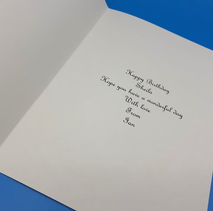 White base card that measures 8x8 inches 20x20cms and comes with a matching envelope and a insert that can be personalised with your own message please see the example of the insert in the pictures