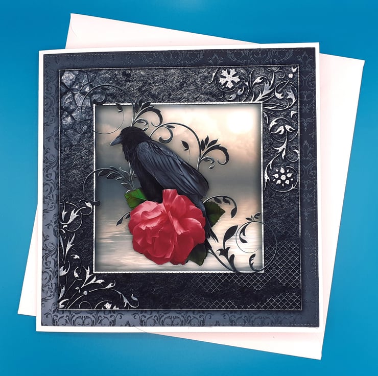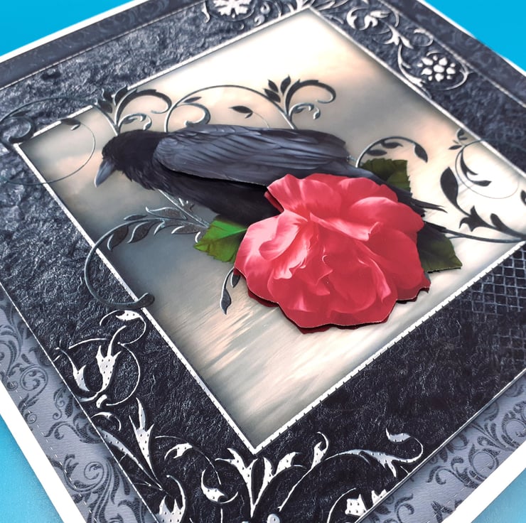 A central image of a Raven perched on a branch with a red rose, the image has been decoupaged to give a 3d effect