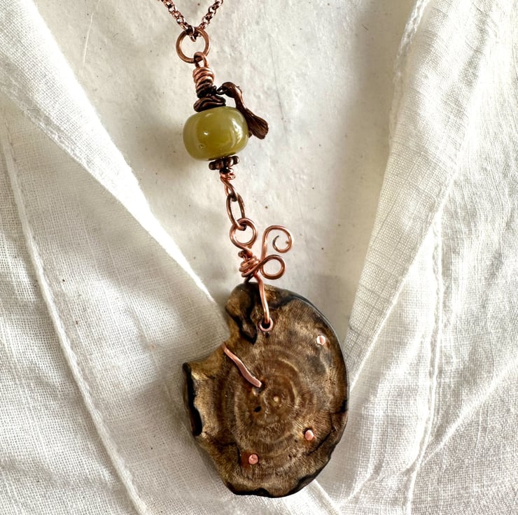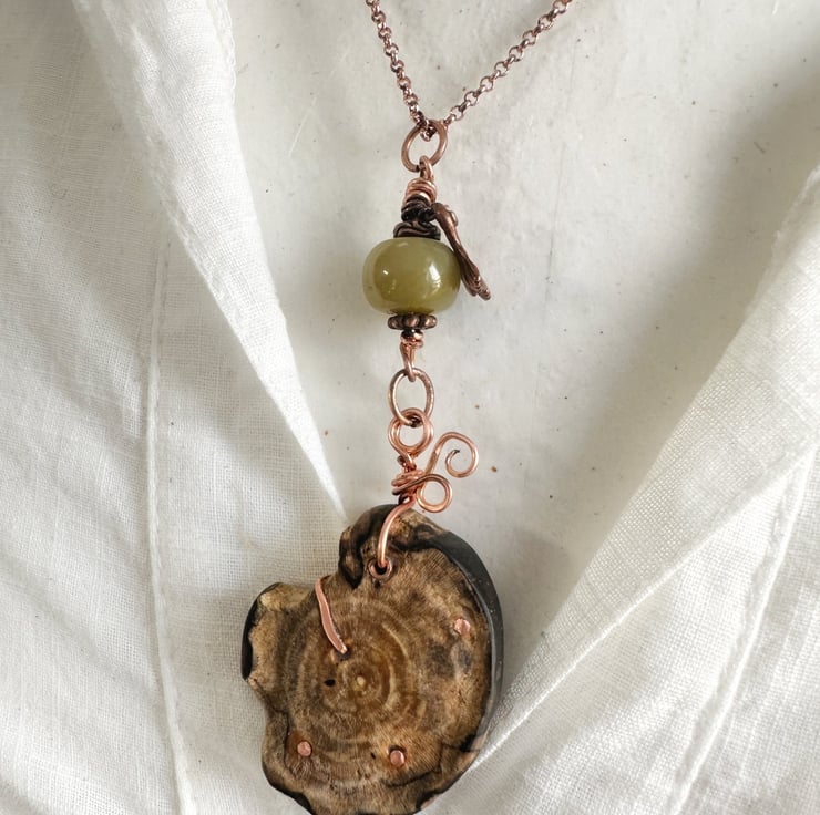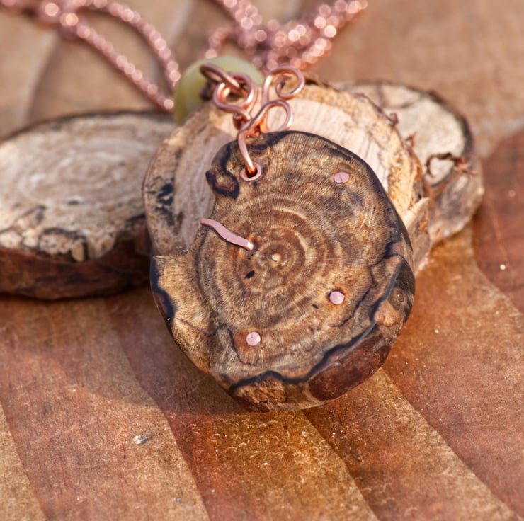 A carved cherry wood pendant created using wood harvested from my own garden. The pendant has been meticulously sanded to a smooth finish and inlaid with copper. The design hangs on a 20 inch copper plated belcher chain. The wood has been polished with a natural beeswax polish containing lavender and olive oil.