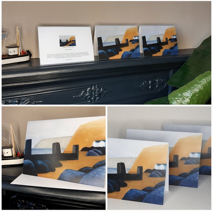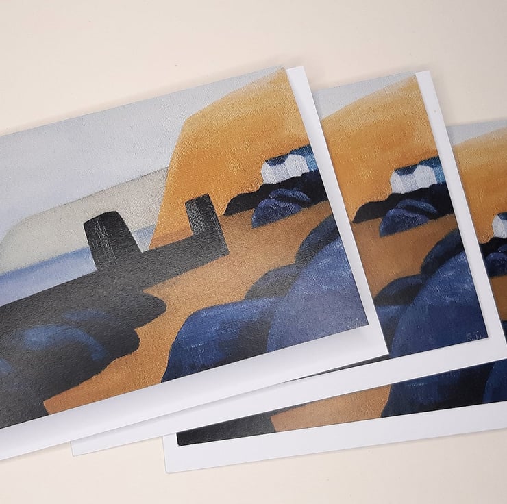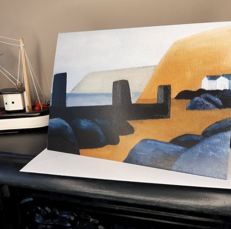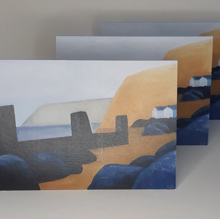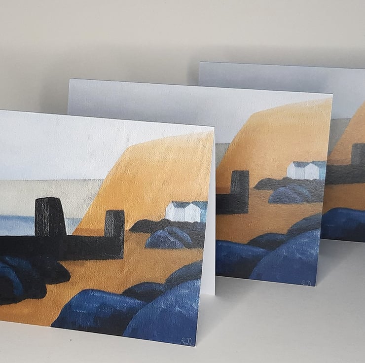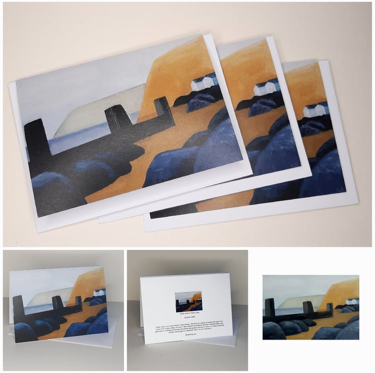 A greeting card reproduction of an original painting. The painting in water based oils is a stylised memory of a Sussex beach showing Beachy Head in the distance.