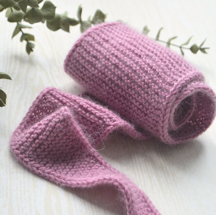An easy to wear small elongated triangular scarf hand knitted from a luxurious blend of extra fine Merino Wool, Kid Mohair and Silk. This makes it both stylish, warm and eco friendly and gives it a gorgeous drape. The edging is not the typical Icord edge, but features a smart flatter edge. The scarf can be worn in a number of different ways. Either way this versatile little accessory will brighten up whatever you wear. Your scarf will be pre-wash treated with an eco friendly solution that cleanses and enlivens the fibres so it will arrive extra soft and with a light fuzzy haze.