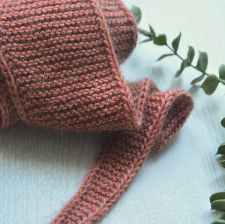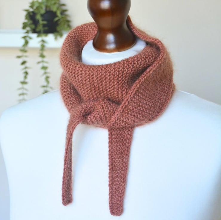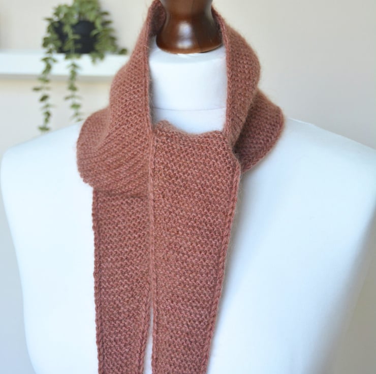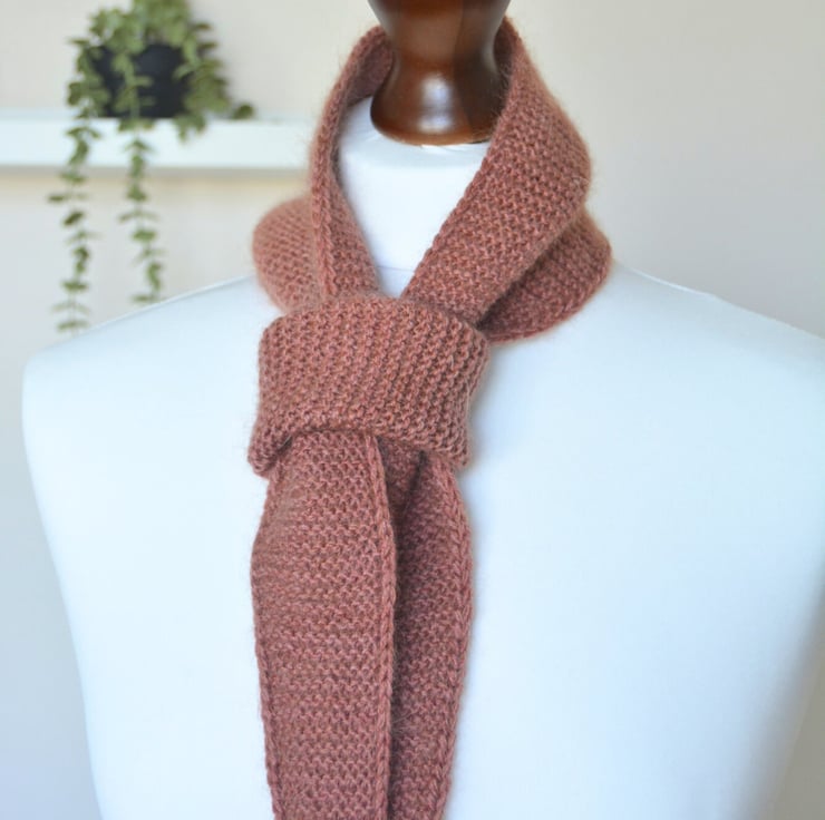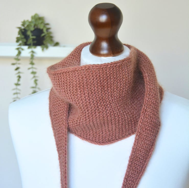 An easy to wear small elongated triangular scarf hand knitted from a luxurious blend of extra fine Merino Wool, Kid Mohair and Silk. This makes it both stylish, warm and eco friendly and gives it a gorgeous drape. The edging is not the typical Icord edge, but features a smart flatter edge. The scarf can be worn in a number of different ways. Either way this versatile little accessory will brighten up whatever you wear. Your scarf will be pre-wash treated with an eco friendly solution that cleanses and enlivens the fibres so it will arrive extra soft and with a light fuzzy haze.