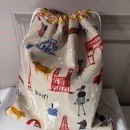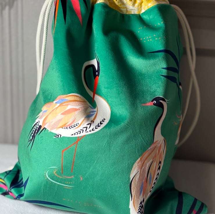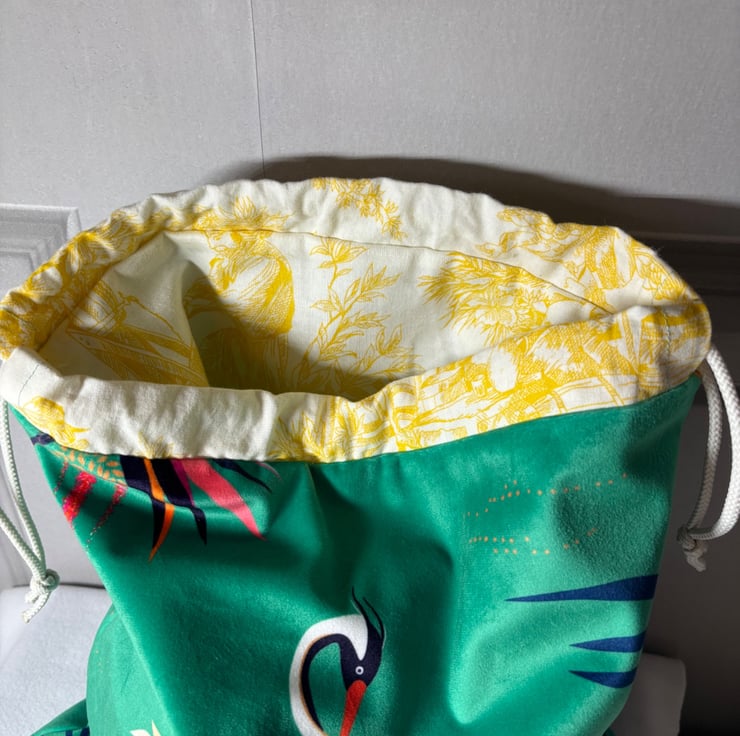 Beautiful velvet feel drawstring bag lined with French themed yellow cotton