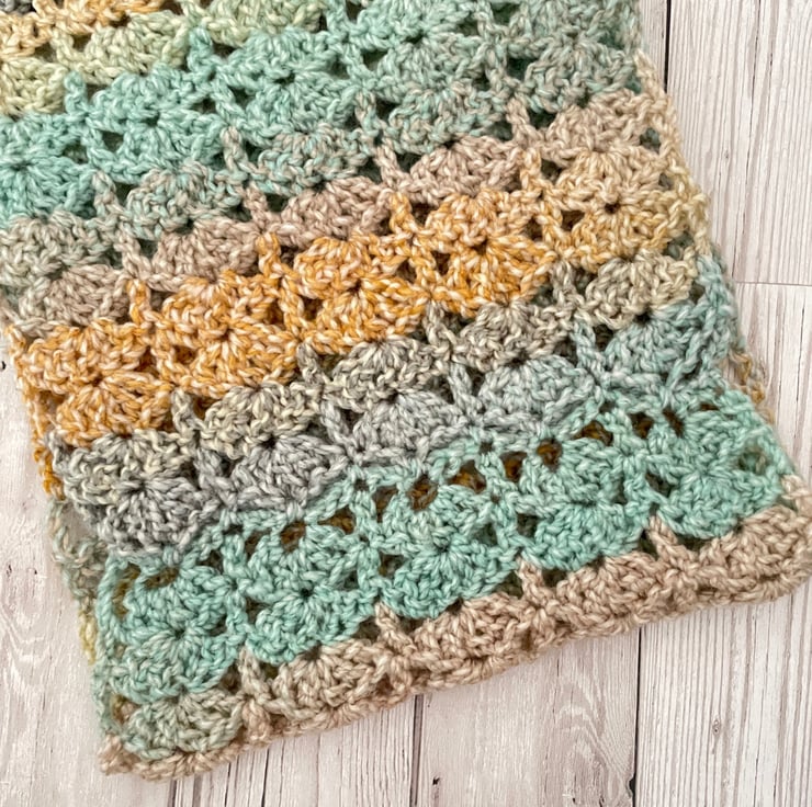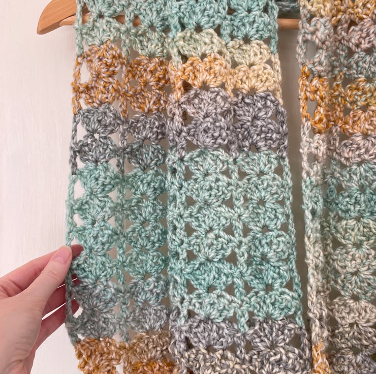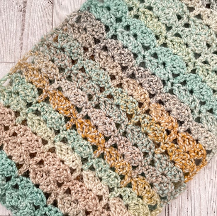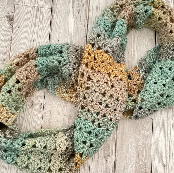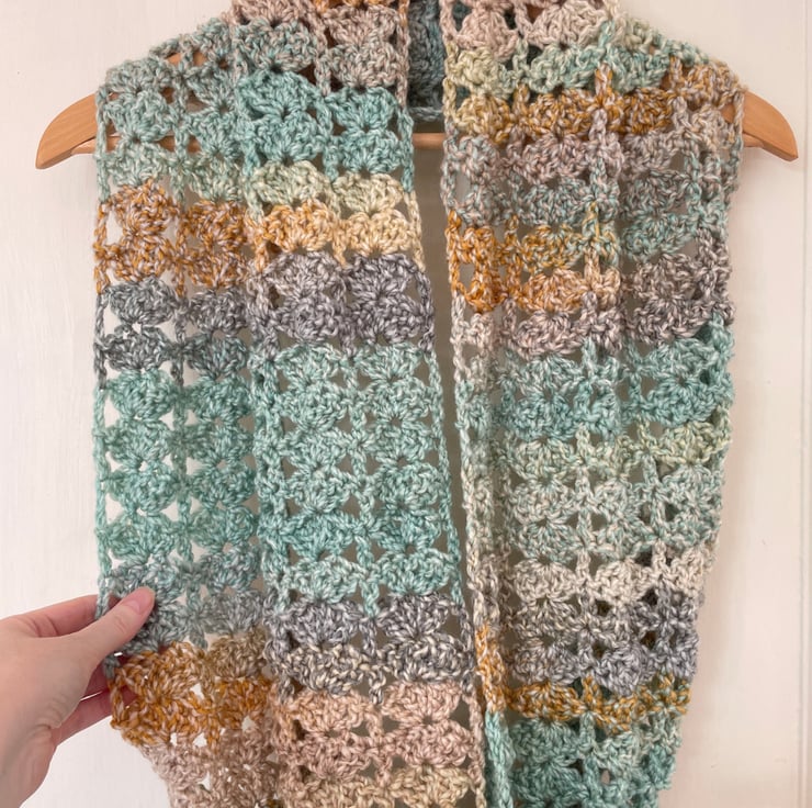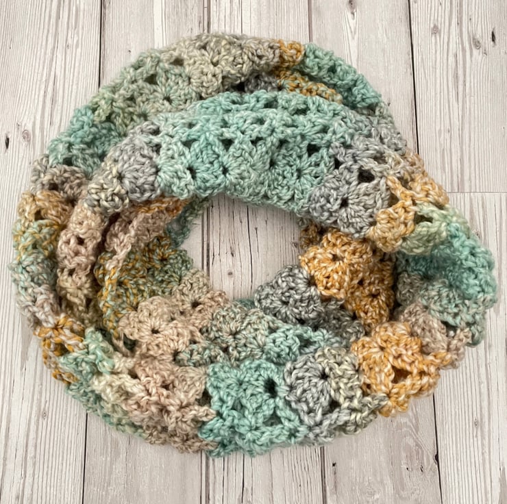 This chunky infinity scarf features a pretty lace shell stitch pattern, and has been crocheted in soft muted shades ranging from duck egg blue and mustard, to grey and taupe. The colours blend beautifully and add interest to the design.