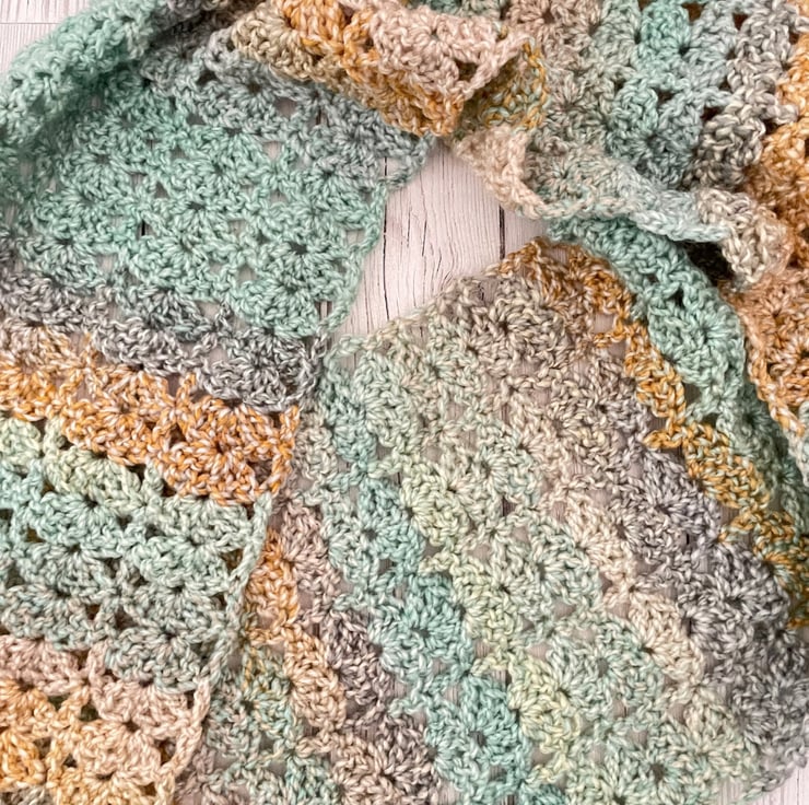 I have listed the scarf at a lower 'Perfectly Imperfect' price as I was a little unhappy with my starting chain which has made the join look less neat than I'd like. You can see this in the third photo.