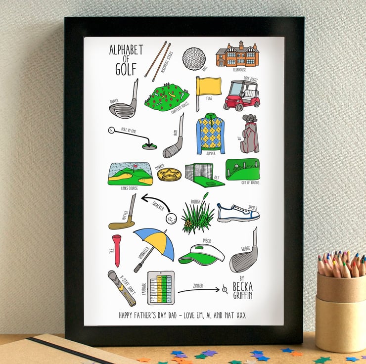 A fabulous alphabet illustration, featuring a full A-Z of golf-related items.