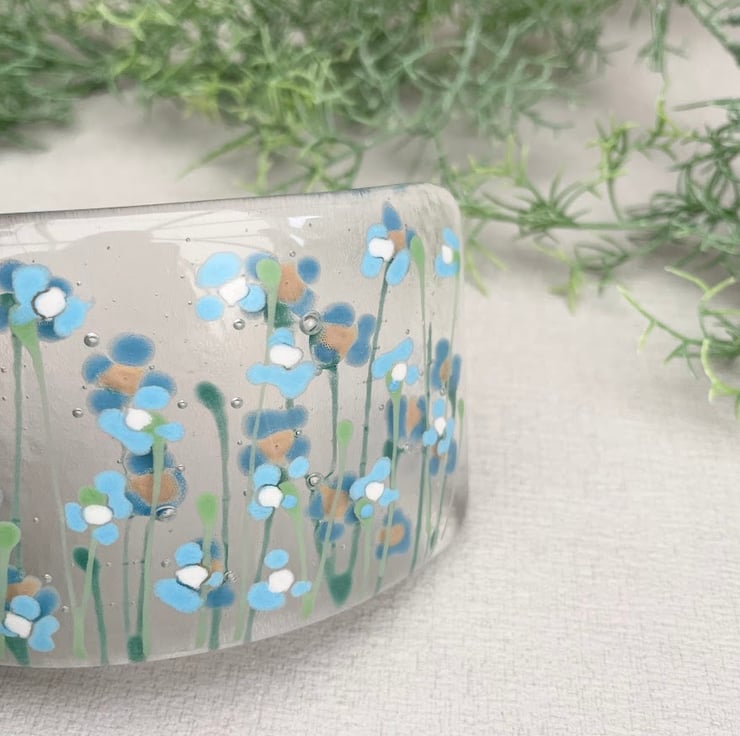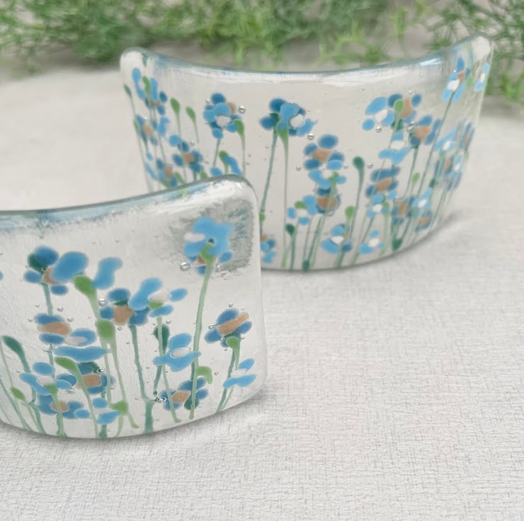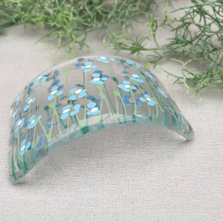 A pretty hand painted floral curve of Forget Me Not flowers. The curve is fired twice in the kiln, firstly to fire the glass paint and then to achieve the curved shape.