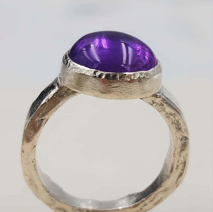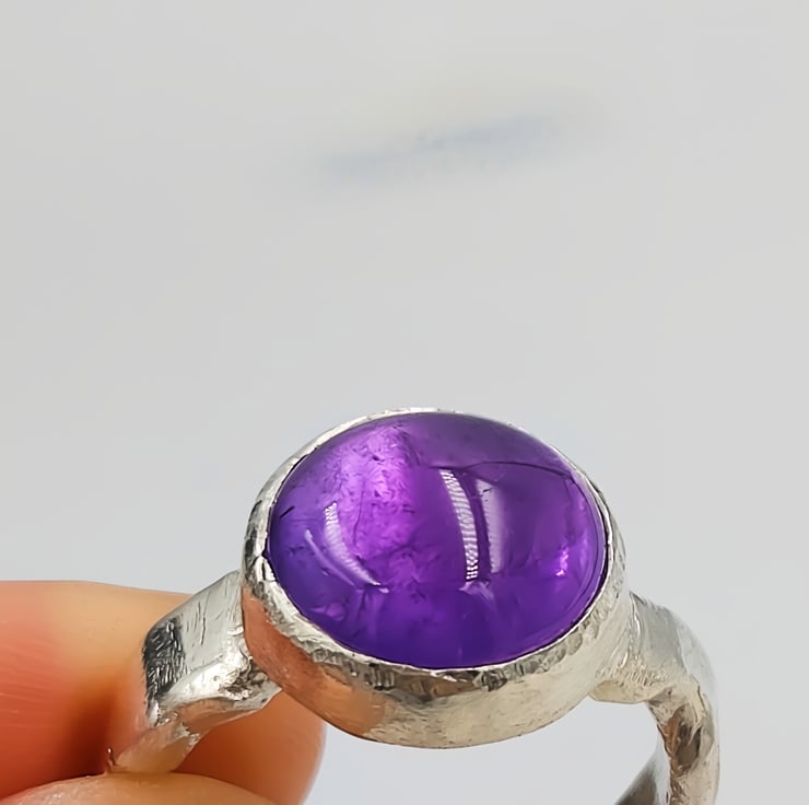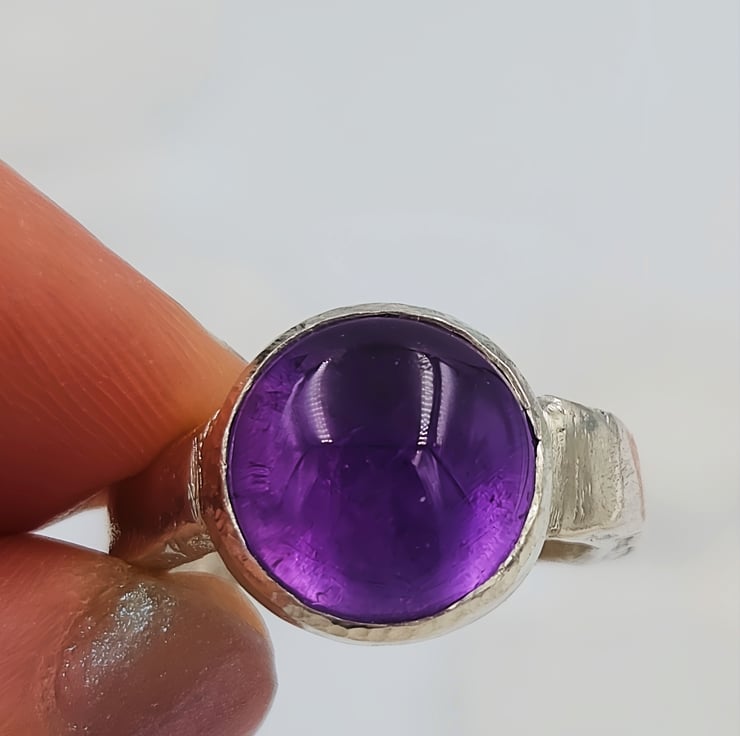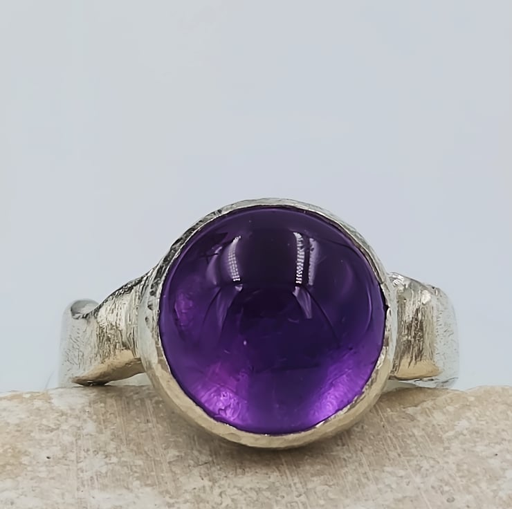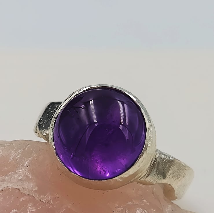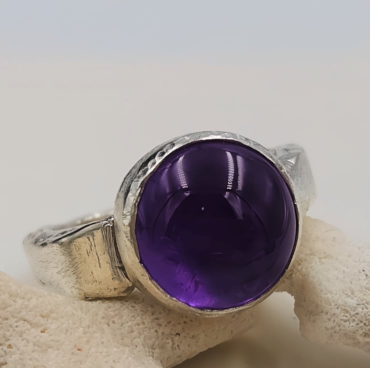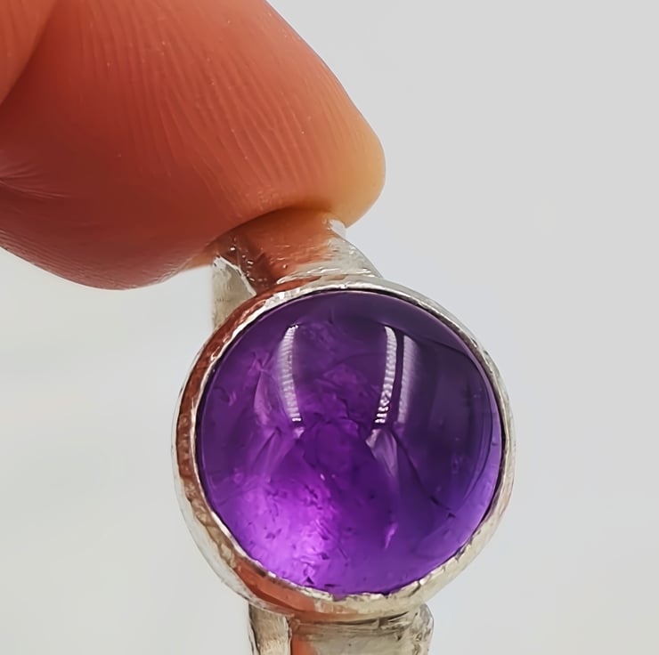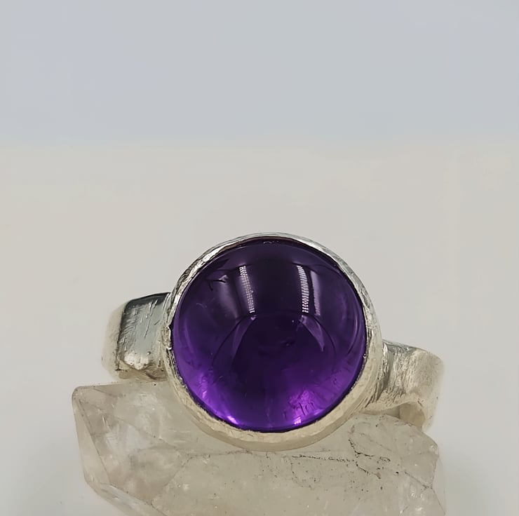 Make a bold statement with this chunky sterling silver ring featuring a large purple amethyst cabochon gemstone. The smooth, domed cabochon cut highlights the rich violet colour of the amethyst, creating a luminous glow that shifts beautifully in the light.