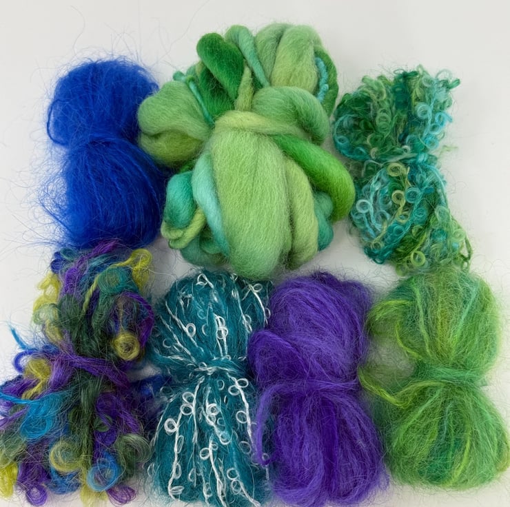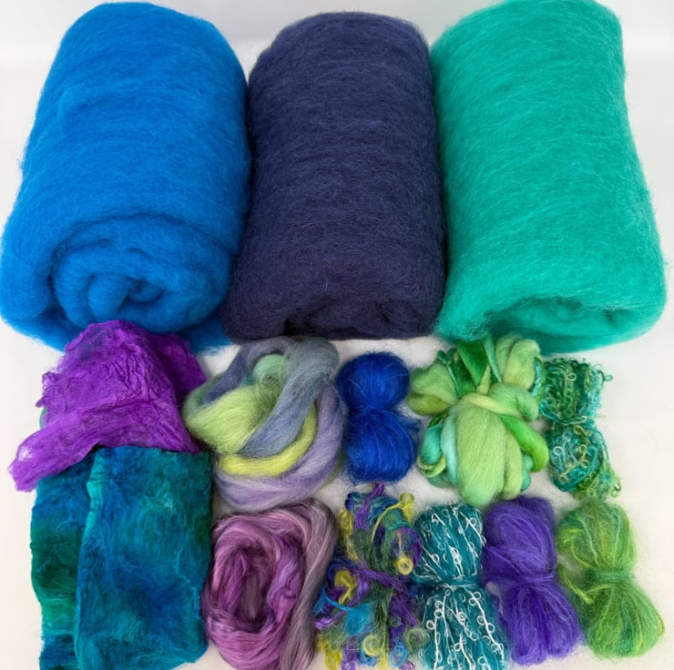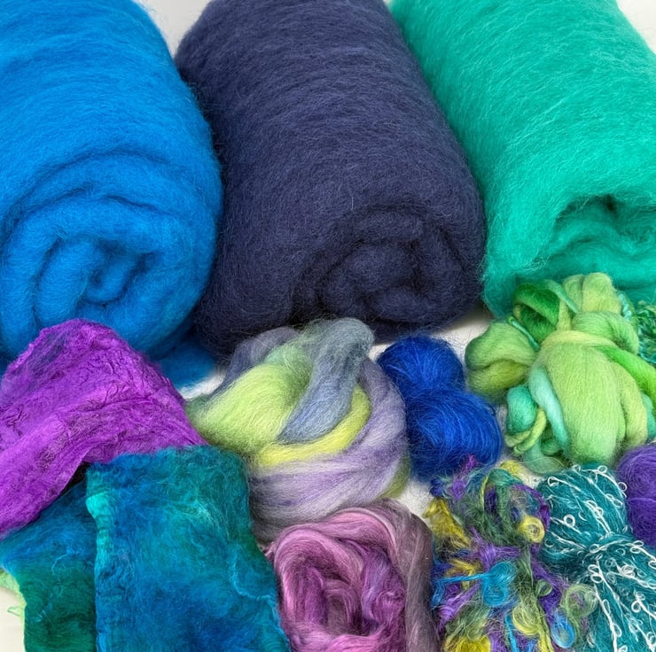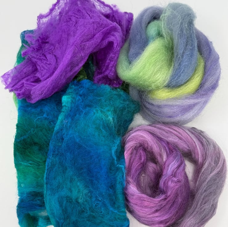 This kit includes all the materials required to make one medium-sized, wet felted bag with a flap closure, clasp, felted-in side rings, strap and inside pocket. The Azure kit is based on a turquoise sea-inspired colourway in blues with green, purple and blue highlights. The kit includes all the wool fibre you need for the felt base, along with a selection of embellishment materials including silk hankies, wool fibres and mohair yarns, some of which have been hand-dyed by artisan dyers. You can use the materials however you like, and the kit includes extra materials to allow you to follow your own inspiration, so you will have some left over. The kit also includes a step-by-step instruction booklet. The photos show an example of a bag made in the Aurora colourway.
