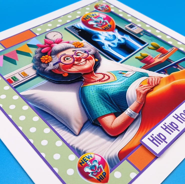 There is a lady sitting up in bed with flowers in her hair looking happy she has a new hip this image has been decoupaged