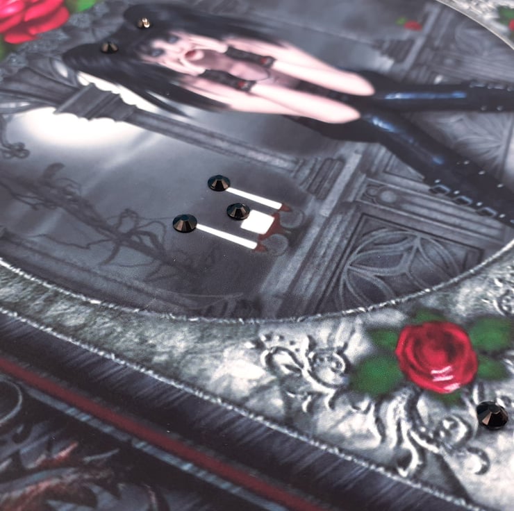 The main image is of a girl dressed in gothic themed clothes sitting on a stone wall with arches, there is a candelabra which has black sparkling stones on the candle lights and the card is finished with black sparkling stones.