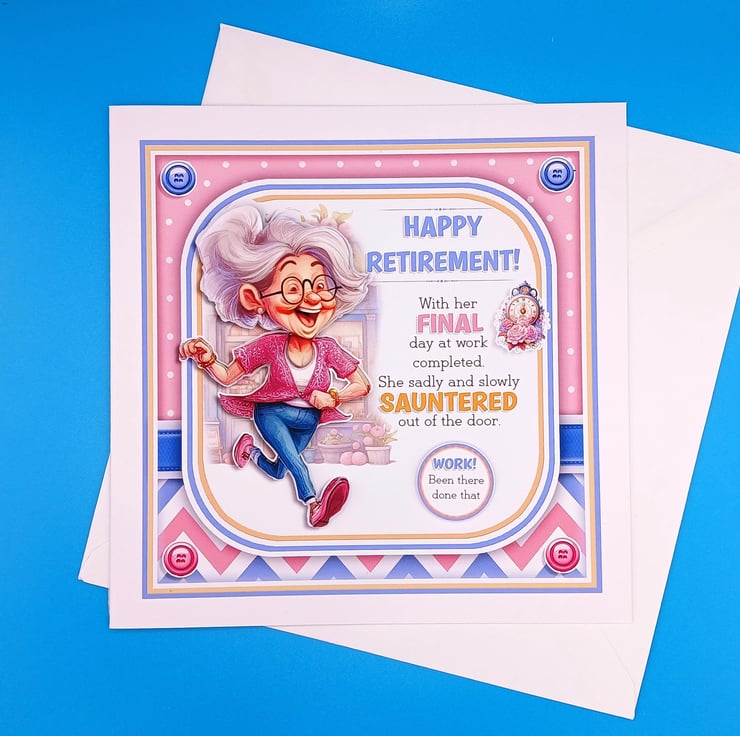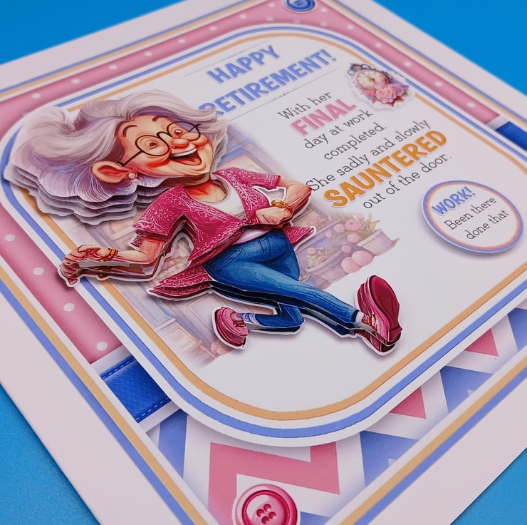 This card has been decoupaged to give a 3d effect and features lady running out of her place of work and the words on the front read "Happy Retirement, with her final day of work completed she sadly and slowly sauntered out of the door' and the tag reads "work been there done that"