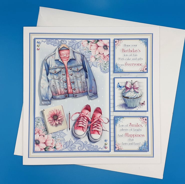 The card is in four designs the largest one that is down the left hand side of the card which has a background of pretty flowers, there is a wonderful decoupaged image of a denim jacket with a pink tshirt underneath it, a pair of pink decoupaged trainers are there to complete the outfit