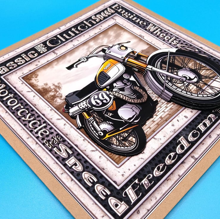 The main design is of a wonderful motorbike which has been decoupaged to give a 3d effect