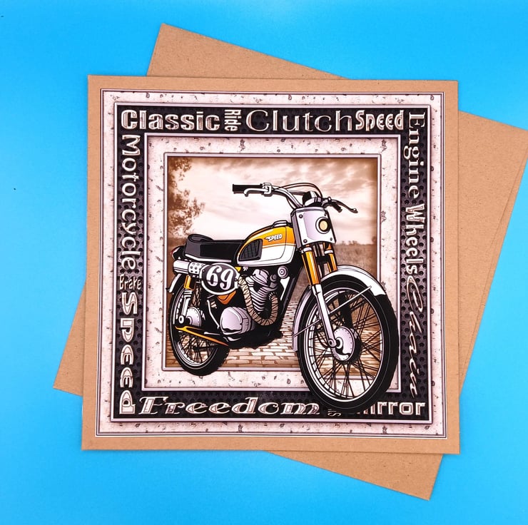 The theme of the card is of motorbike round the sides of the card are words related to motorbikes clutch speed freedom and many more