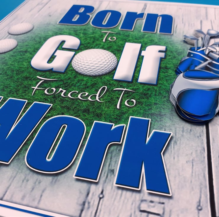 The card has a grey back ground with grass effect and 'Born to Golf Forced to Work" are the bold words on the front of the card there are images of golf balls and there is a bag of clubs that has been decoupaged to give a 3d effect