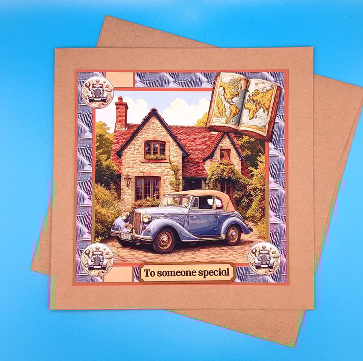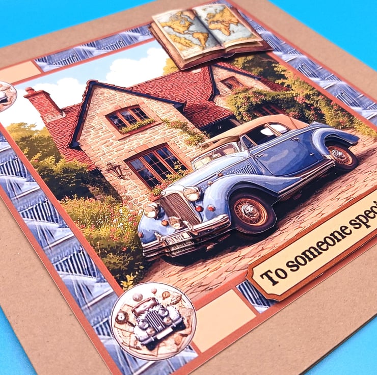 The main design is of a classic car in a beautiful grey shade the car has been decoupaged to give a 3d effect and to make it stand out, theire is a 3d map in the corner of the card