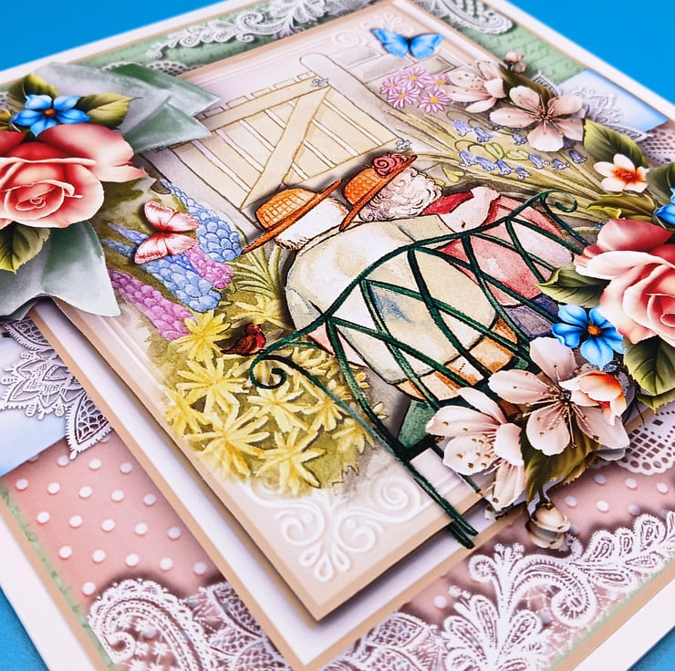 The background of the card is of images of lace, the main design is of a couple sitting on a bench in a beautiful garden surrounded with flowers the design has been lifted up to create a 3d effect
