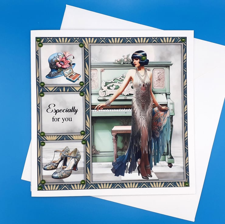 The main image is of a 3d lady wearing clothes from the art deco era and there is a piano with a stool.