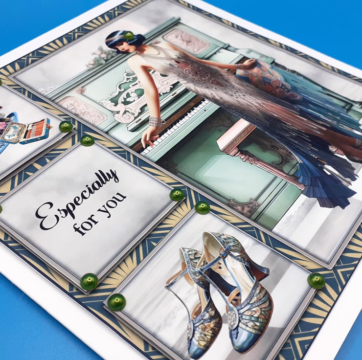 Down the left hand side are three square that have a 3d effect, one has an image of a very grand hat, a pair of marvellous shoes are shown in one and the centre one has the greeting "Especially for you"