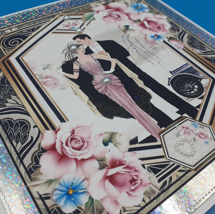 The main design is an Art Deco style man and women surrounded by flowers and edged with pearl stones and a pearl coloured open heart.