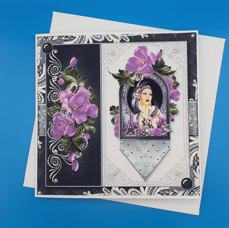 Art deco design a lady dressed in art deco styled clothes surrounded with purple flowers.