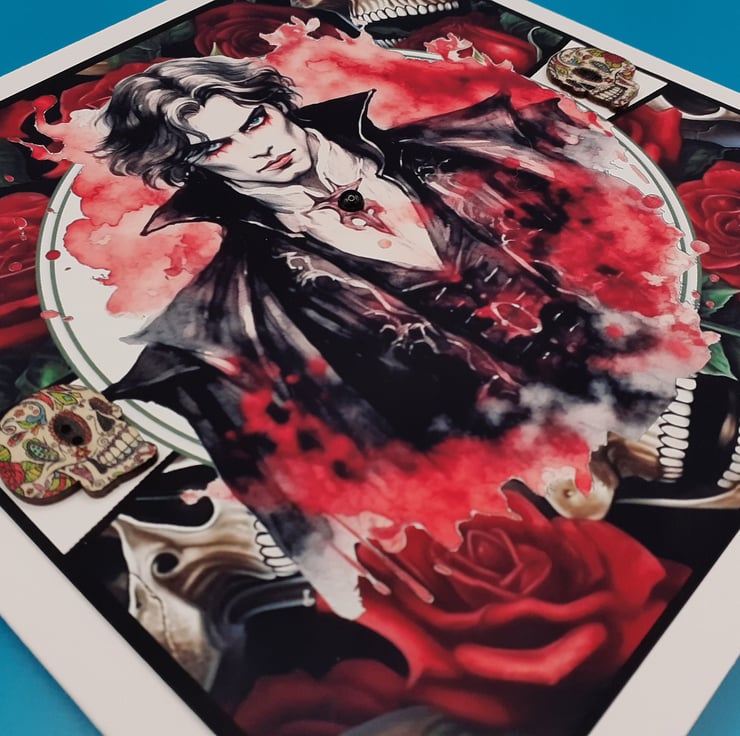 This gothic card is an explosion of everything that is gothic featuring skulls dark red flowers