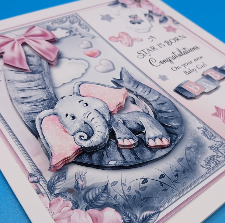 The main image is of a 3D baby elephant sitting on a trunk with a pink bow all of which have been decoupaged to give a 3d effect