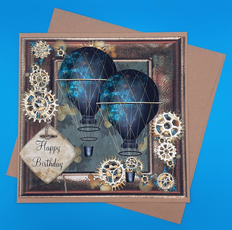 The main main design of a border of gold and copper with images of cogs and wheels along with two hot air balloons I have added gold coloured cogs and wheel to give this card a special look