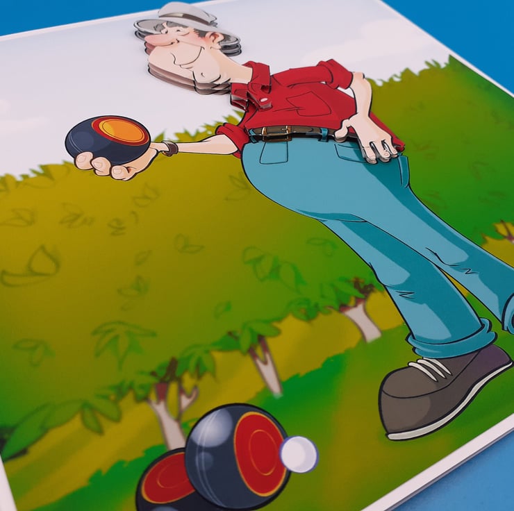 The main design is of a gentleman playing bowls he is wearing grey trousers and a red top with a grey hat that have been decoupaged to give a 3d effect.