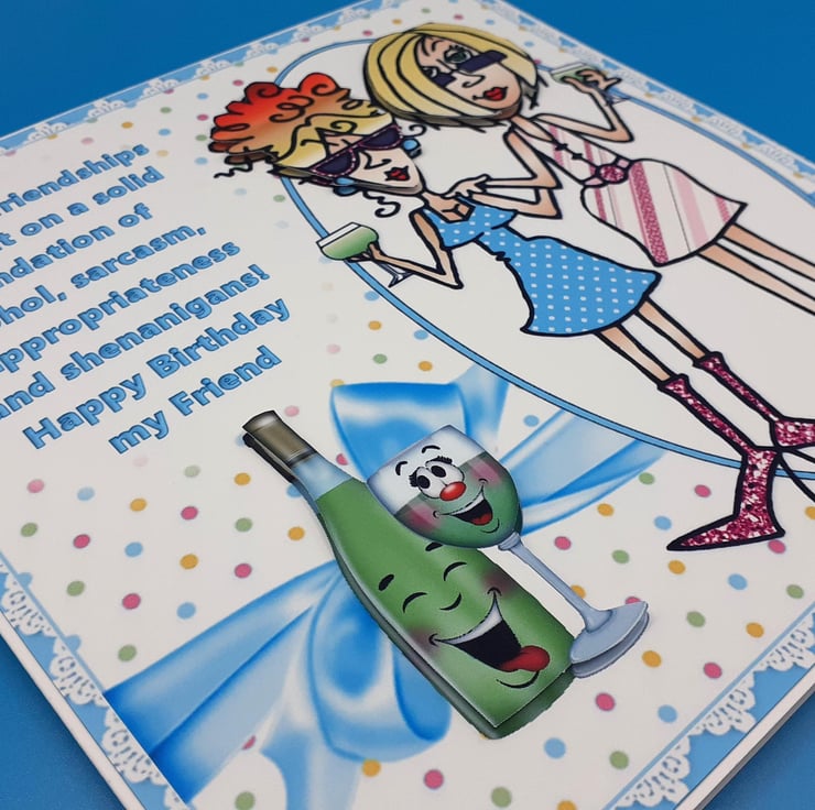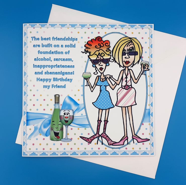 The greeting reads 'The best friendships are built on a solid foundation of alcohol, sarcasm, inappropriateness and shenanigans! Happy Birthday My Friend'.