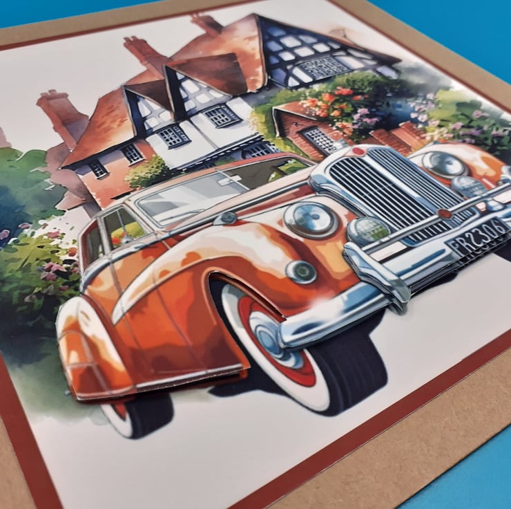 The main design is of a classic car in a beautiful brown shade the car has been decoupaged to give a 3d effect and to make it stand out