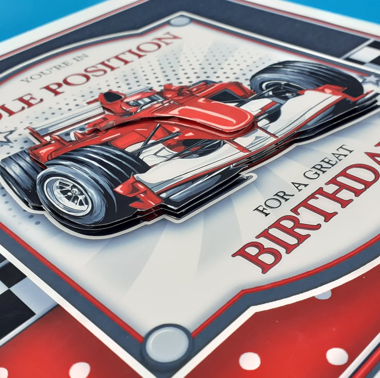 The words on the front of the card reads "You're in Pole Position for a great Birthday"