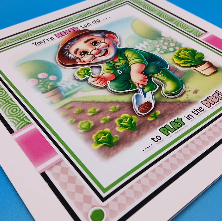 The background of the card is of a garden scene a gentleman dressed in dungarees and of course his Wellington boots he is holding a trowel ready to plant his plants all of this has been decoupaged to give a 3d effect