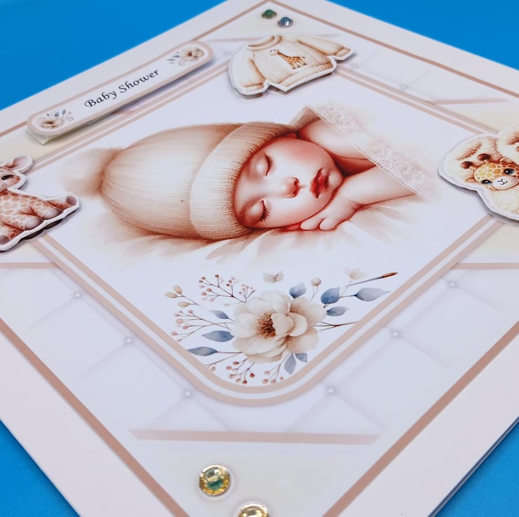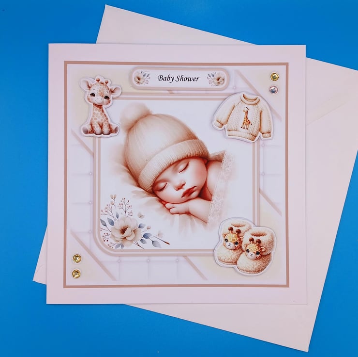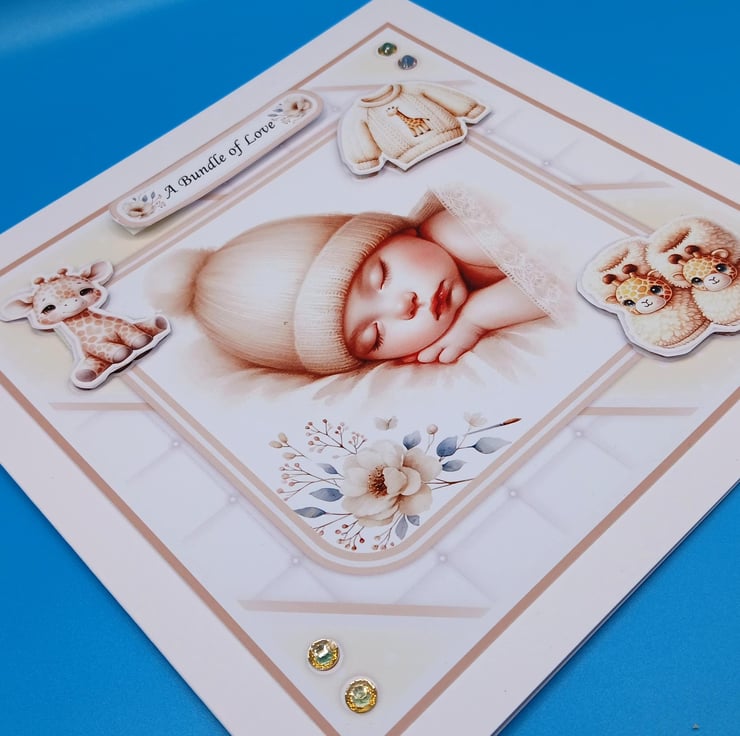 Around the design are 3d images of a giraffe, bootees and a Baby jacket, pretty sparkling stones have been added to the card