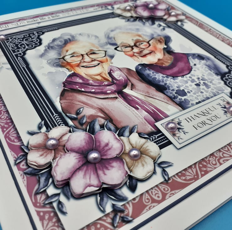 The greeting at the top of the card reads "Friends make life a little sweeter" and the greeting at the bottom of the card reads " Thankful For You" and I have added beads to this and onto the four corners of the card.