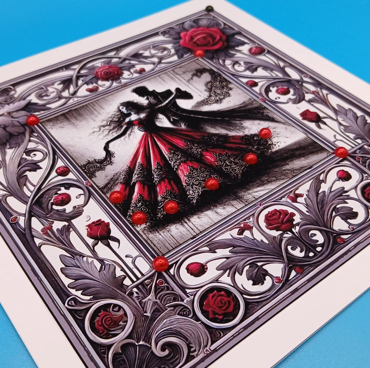 In the centre is an image of a lady and gentleman dressed in gothic style clothes along the hem of the dress and in the four corners of the card I have added black and red pearl effect stones