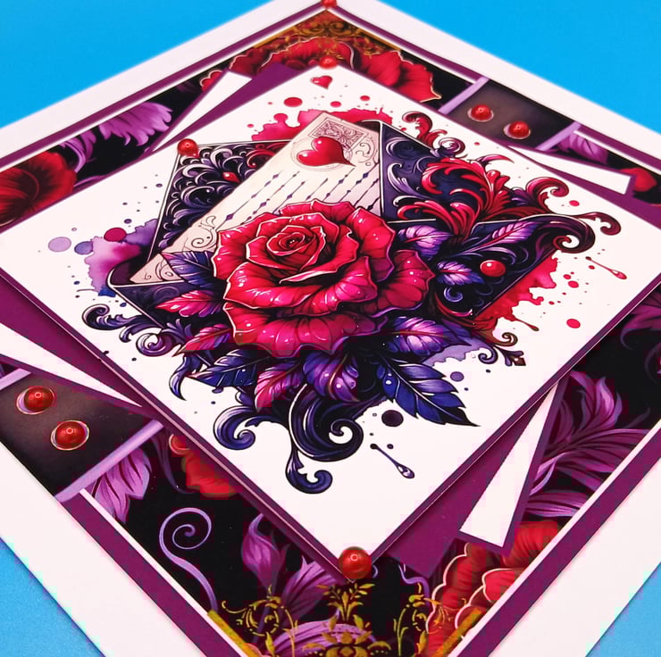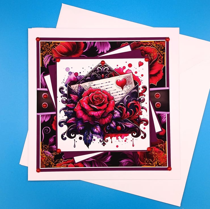 The main design is of a layered design and it has a design of an envelope with a red rose and red hearts