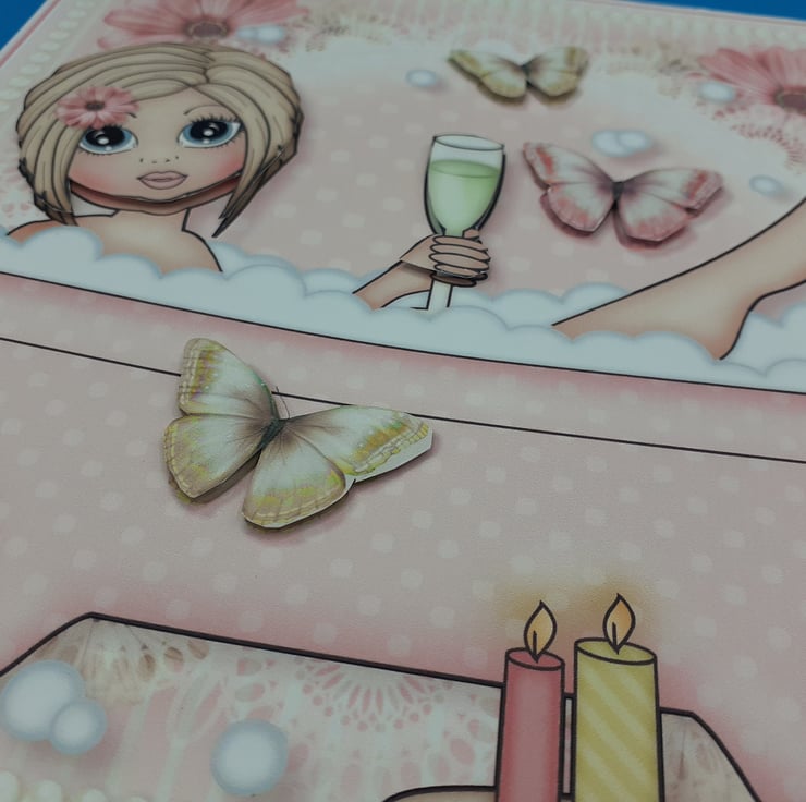 The main image is of a lady relaxing with a glass of bubbles she is surrounded with soap bubbles, the lady and the butterflies and the glass has been decoupaged to give a 3d effect.