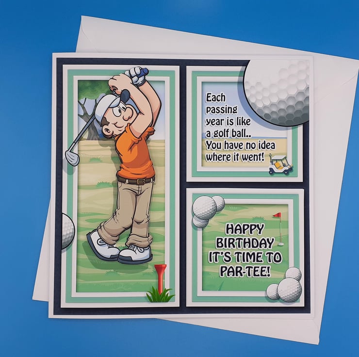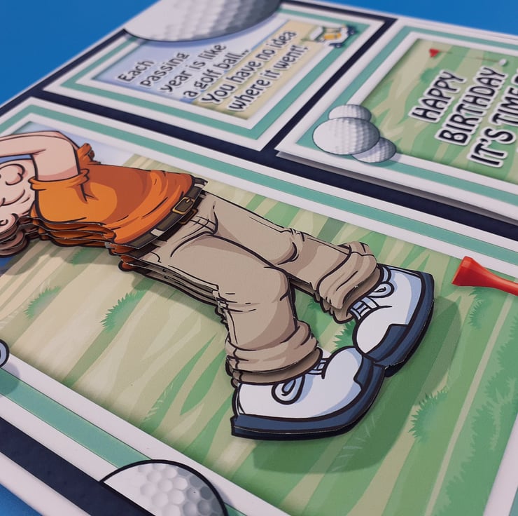 The card has a 3 part design of - a 3D golfer enjoying a game of golf.