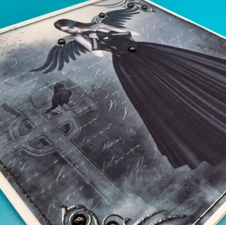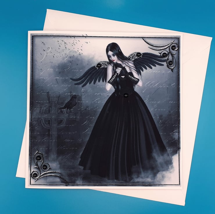 The main image of a gothic lady wearing a black gown and she has magnificent black feathered wings and I have added a black pearl effect acrylic stone bead to each one