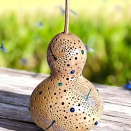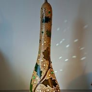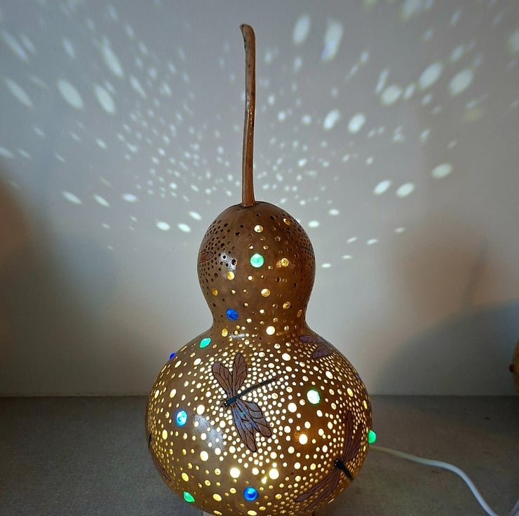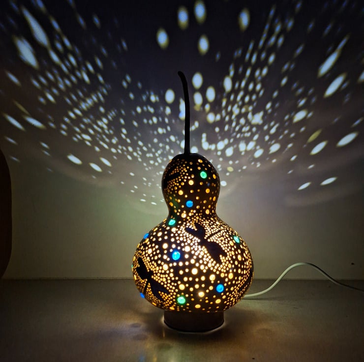 I love making these lamps, ther are so many processes involved. From cleaning the gourd, designing, cutting, sanding, painting - several coats!