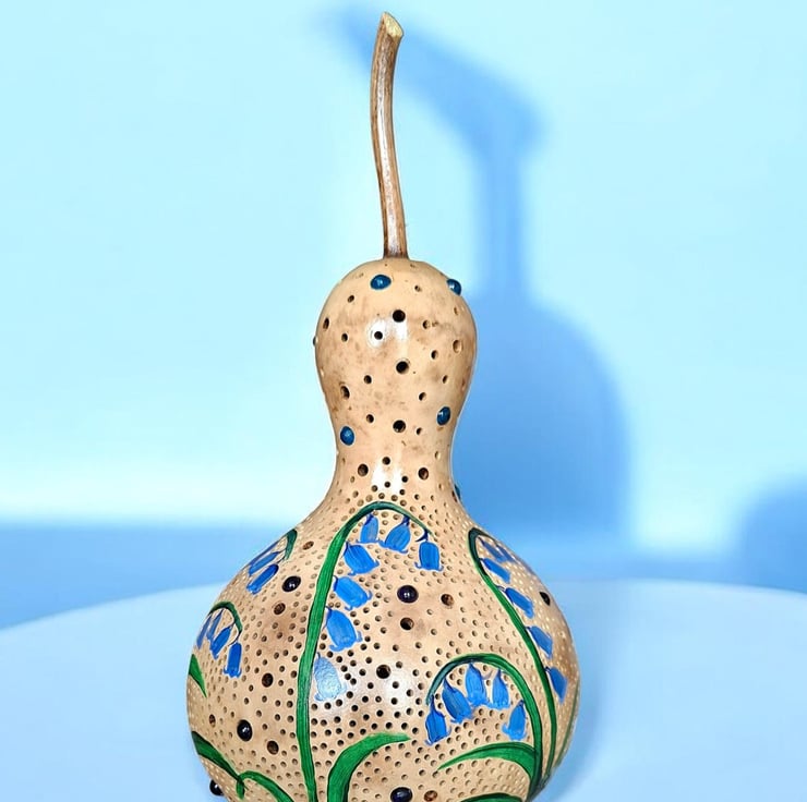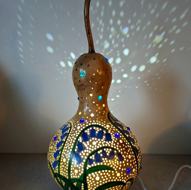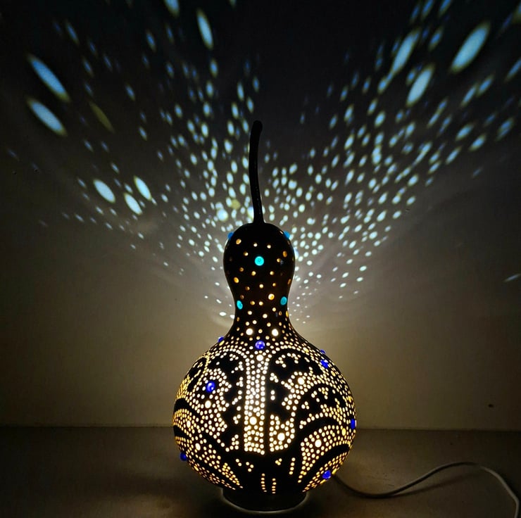 I love making these lamps, ther are so many processes involved. From cleaning the gourd, designing, cutting, sanding, painting - several coats!