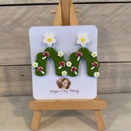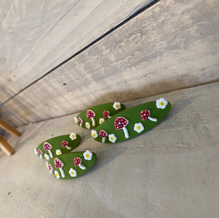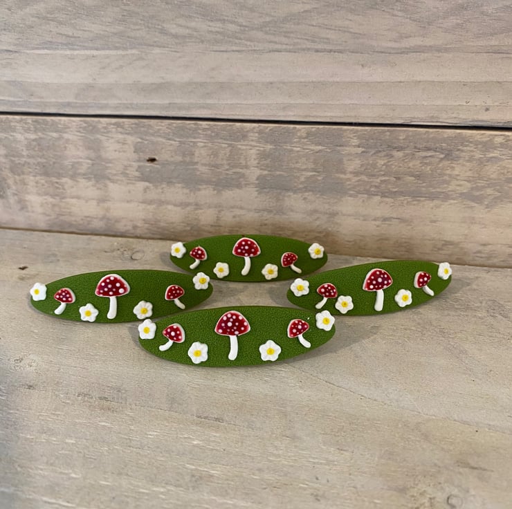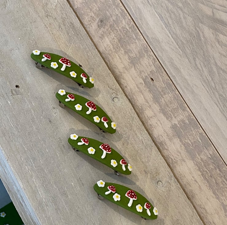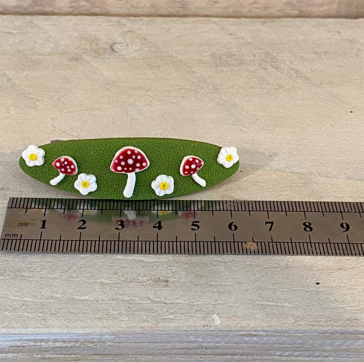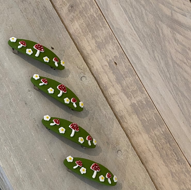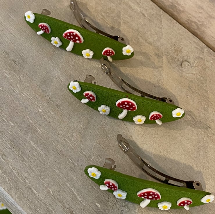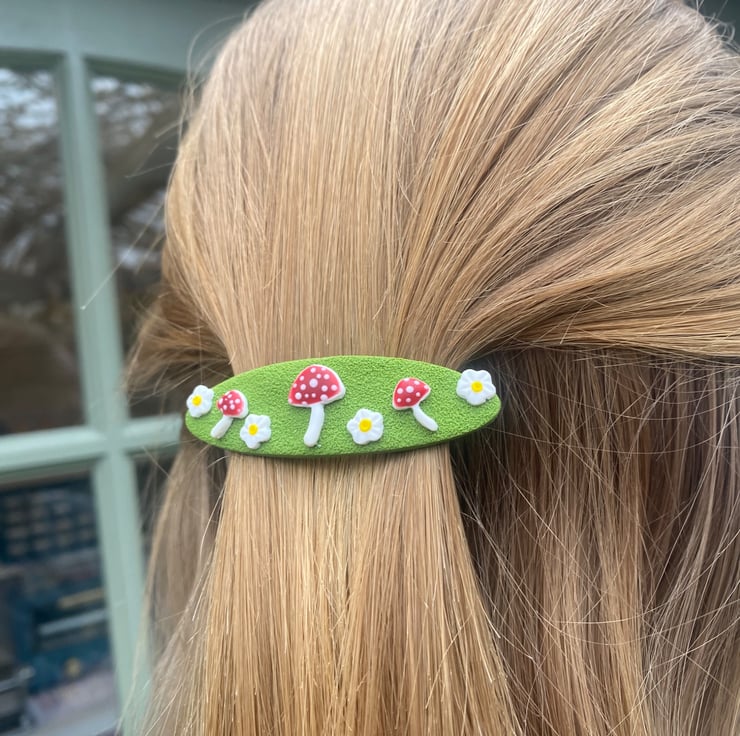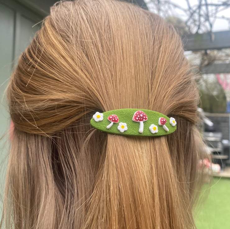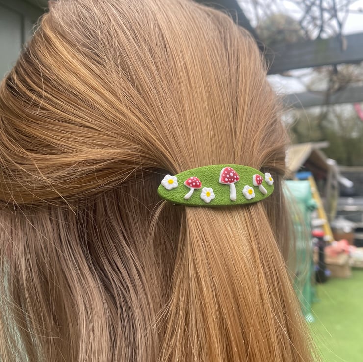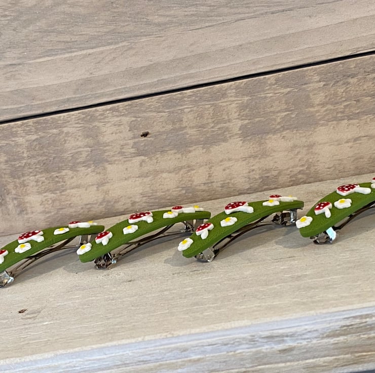 Add a touch of woodland charm to your hairstyle with this handmade barrette hair clip from the Moss & Magic Collection. Featuring a textured green base decorated with adorable red toadstools and tiny white flowers, this piece brings a whimsical, nature-inspired feel to any look.