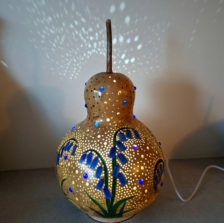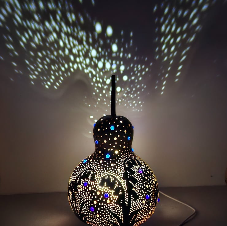 I love making these lamps, ther are so many processes involved. From cleaning the gourd, designing, cutting, sanding, painting - several coats!